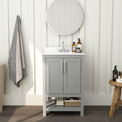 Stylish Design: The clean lines and golden handles add a sense of fashion to the bathroom cabinet, while the gray finish paired with a white basin brings a refreshing look.