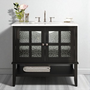 Upgrade your bathroom with this 36-inch freestanding vanity, combining timeless elegance with practical functionality. Featuring a sleek ceramic sink, soft-close doors, textured glass panels, and solid wood tapered legs, this vanity is built to last and designed to impress. Its open and adjustable shelving offers flexible storage, while the white waterproof painted finish ensures lasting beauty in humid environments. Perfect for both modern and transitional spaces, this vanity delivers refined style with everyday durability.