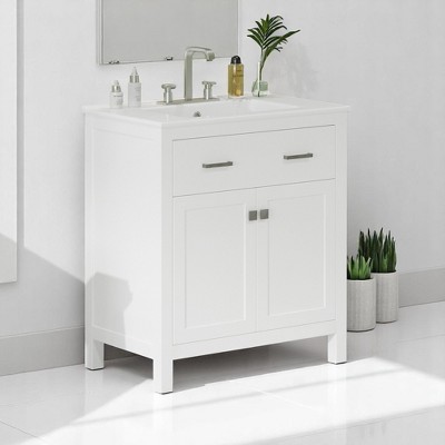 Upgrade your bathroom with this stylish and functional 36-inch freestanding vanity. Featuring a modern design and painted white finish, this vanity is constructed from durable MDF and solid wood components for lasting use. The integrated ceramic sink top includes pre-drilled 4-inch centerset faucet holes, offering both elegance and convenience. With multiple storage options and an easy-access rear cutout for plumbing, this vanity combines beauty and practicality in one space-saving unit.