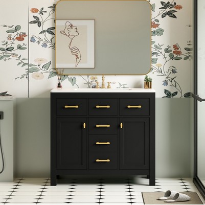 Upgrade your bathroom with this 36" Modern Bathroom Vanity Set, featuring a glossy ceramic sink and ample storage with 4 smooth drawers and 2 soft-close cabinets. Crafted from solid pine wood frame and high-quality MDF boards, this vanity offers exceptional durability with a 300lb weight capacity (50lb per panel/drawer). The waterproof painted finish resists moisture, while the elegant gold handles add a touch of modern luxury. The 0.9" thick sink edge and included anti-spill hole provide practical functionality, and the 4" centerset faucet compatibility (faucet not included) ensures easy installation. With its smooth slide rails and spacious storage, this freestanding vanity combines style and organization for a clutter-free bathroom.