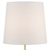 - White marble base with brass finish accent. White linen UNO tapered drum shade. Pattern on base may vary due to natural materials.