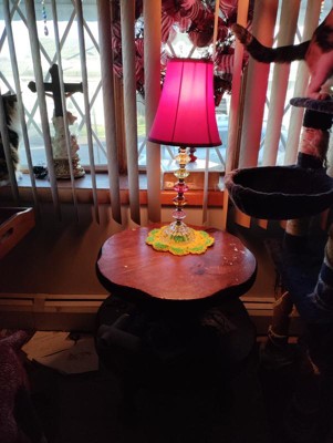 This little table lamp sits perfectly on a two tier table that my late mother had given me. It sits on the table in front of our bay window. The lampshade is pink so when dark and we put on the lamp it's pink in here!!! I love it and would highly recommend