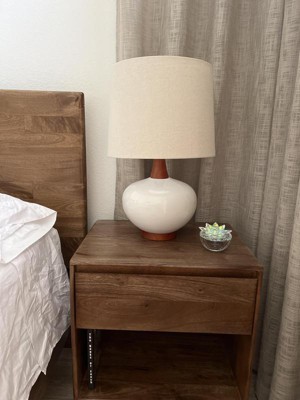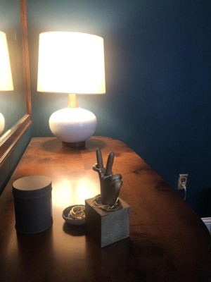 I love this lamp! Clean, neutral, and it completes the look of our bedroom. It’s big but not obtrusive at all. We switched out to a dimmer and it’s perfect.