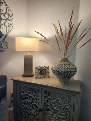 Ideal for modern farmhouse rooms or for adding a contemporary luxe look to a favorite space, these lamp designs will shine in any setting. From the 360 Lighting brand, the pair of lamps feature hammered rectangular bases with a footed pedestal base in a faux wood finish. Up top are oatmeal fabric rectangular shades that complete the look.