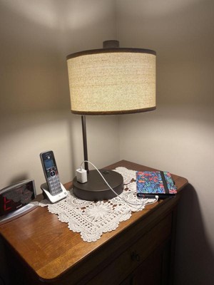 Very nice almost dark bronze Lamps Plus 360 Lighting lamp! Love the added features of a toggle switch for on and off, an extra plug, and an extra USB slot in the base of the lamp. Very handy! Height is perfect for table side and looks modern but still traditional too. Lamp shade is a perfect size drum shape for the lamp, has a beige linen shade, and has a warm but bright ambiance when on. Takes either LED or incandescent bulbs. Really like it!!