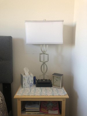 With abstract-shaped bases in a brushed nickel finish and curved rectangular shades, these modern table lamps make bold statement pieces. Each design sits on top of a black marble pedestal. Each lamp has an integrated USB port for easy charging of your devices. The USB ports work with the light turned off and are meant for use with smartphones.