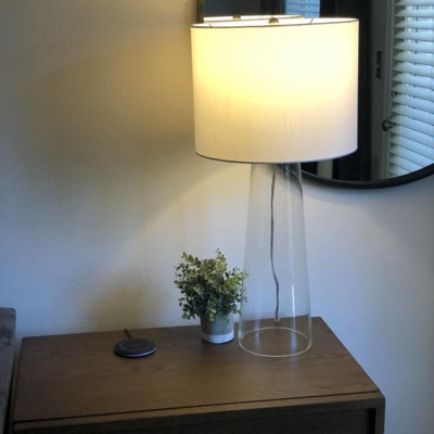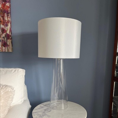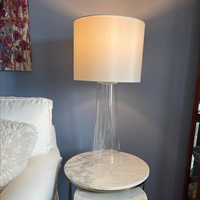 Very nice table lamp beside my loveseat. Fits perfectly on my marble nesting table, that is not very large, leaving room for a coaster for a beverage or book. The clear glass doesn’t compete with other colors in my room on the wall behind it or picture on the wall. The shade is good quality. Don’t let the price fool you. This is a nice lamp without spending a lot of money.