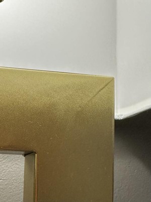 - Gold finish lamp base. Open, rectangular lamp base profile. Metal construction.