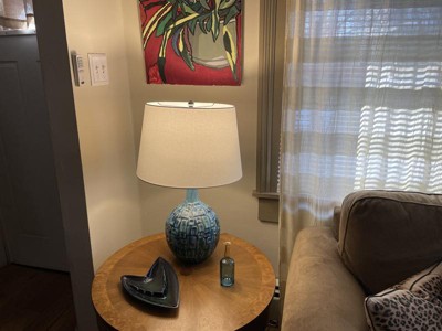 This lamp has received positive feedback for its beautiful design, vibrant colors, and suitability for various decor styles. Guests appreciate its elegant look and the quality of materials used. Many find it perfect for bedside tables or living spaces, enhancing the overall ambiance. However, some guests wish for a three-way bulb option and have noted color discrepancies in the received product. Overall, it is a stylish addition to any home.