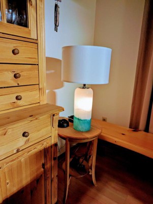 This lamp looks perfect in out family room. It has shades of green and blue--and lights 3 ways, the base lights internally as a night light, the bulb lights in a traditional way, and then both light at the same time. We especially love the night light--shows the beauty of the glass base.