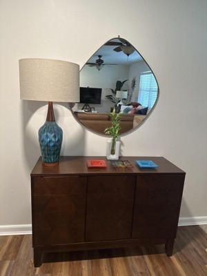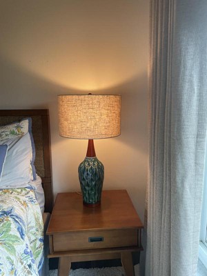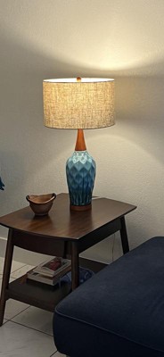 This is the perfect addition to our mid-century decor. The artisan style ceramic is a beautiful blue/green glaze, with warm wood accents. I have ordered several items from Lamps Plus and am never disappointed. It arrived quickly and was packed securely.