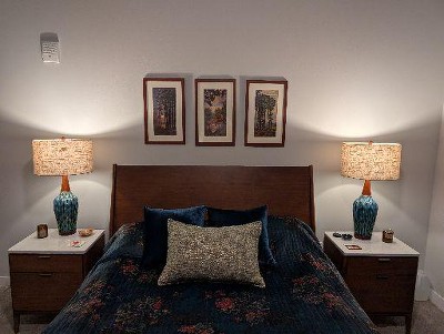 Absolute Mid Century Modern. Makes the Bedroom! The. Wood accent on the lamp really makes this a stunner! Originally thought wood was too light but goes great against my "Alfesco" Benjamin Moore Aura paint . The shade is divine and adds the perfect light and dimension to create great ambiance. I have Lifx bulbs through house so I can change ambience in a heartbeat.