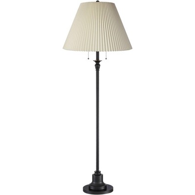 The classic traditional style of this floor lamp adds simple elegance to your living space. With an exquisite oiled bronze finish and an off-white shade, this timeless design is sure to gracefully blend into your classic-looking home. The twin pull chains make it easy to turn each light on and off. A black finish round riser is included to give the lamp extra height and presence in a room.