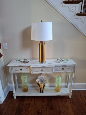 I purchased this lamp for use on a narrow table in the entryway of my home. I liked the brass finish because it blends with the chandeliers above the entryway. The clear base is also a nice touch.