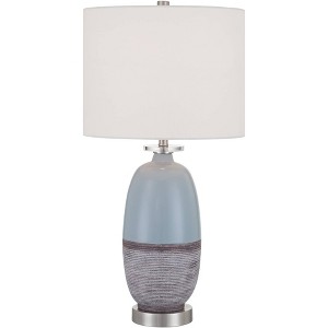 The Stratos mid-century modern style table lamp, from the 360 Lighting brand, features a beautiful blue cloud finish ceramic base with a textured gray tone lower half for visual interest. A white fabric drum shade tops this design, hiding the bright 3-way bulb this lamp uses for maximum lighting. Ideal for home offices or living spaces that need a dash of charm emulating the bright blue sky.