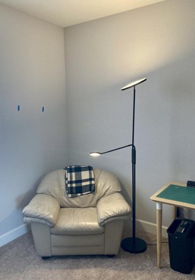 This lamp arrived very well protected and in unblemished condition. Assembly took two minutes. The top lamp lightens up the entire room. The lower lamp is great for reading. Both lights are full adjustable in intensity and aim. The controls are easy to reach from an armchair next to the lamp. I couldn't be happier with this lamp.