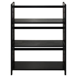 Sturdy and stackable, the X-Design 3-Shelf Folding Bookcase is ideal for any storage. 3 shelves to maximize storage and decorative displays. Stackable design allows your storage and home design to grow when you need them to. Effortless foldable engineering means you can transport or store with ease. Constructed from solid wood for lasting beauty. No assembly required. Product dim (expended): 27.5"W x 11.5"D x 38"H. Folded dim: 27.5"W x 2.5"D x 38"H.