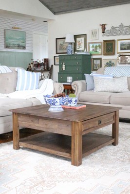 Looking for a rustic contemporary Coffee Table? Look no further than the Garret Square Coffee Table. Its beautiful and distinct Acacia wood makes this table the perfect piece to become a focal point of your room. Two large drawers and open storage space beneath offers both practical and decorative storage options. The shaker style paneling and Antique Brass pulls are the finishing touches that make this table the right choice for your space.