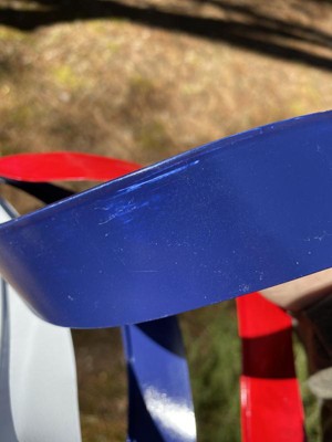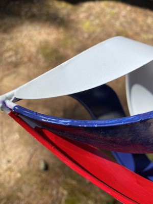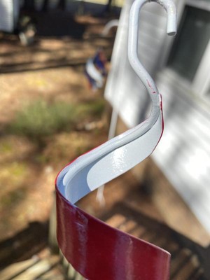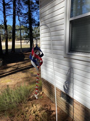 [This review was collected as part of a promotion.] I really like this metal yard spinner in regards to it’s looks and ease of putting together. To start, it comes with its own shepherd’s hook which is great. It’s in a few pieces that easily screw together and, once assembled, goes easily into the ground. The spinner hangs and spins on the hook with just a little air flow. The colors on the spinner are bright and stand out. While I like those features of the product, I have to question the overall quality and durability of the product. While things left out in the elements naturally wear over time, it’s nice for a product made for the outdoors to last as long as possible. The paint job on the spinner has some drips and uneven coating which I don’t find appealing. The red and blue paint portions of the spinner are completed after the white portion by the looks of the product, so at the bottom and top of the spinner you can see the layers of paint. This concerns me thinking that this may allow for chipping and wear points. With those items being noted, I would recommend this spinner because of it’s attractive and patriot look as well as really liking that it comes with its own 38” shepherd hook. Just be aware that the spinner may only last a few seasons before needing replacement.