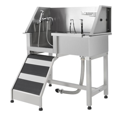 38in Stainless Steel Dog Washing Station with Non-Slip Grate, Shower, Soap Box, Faucet, 220lbs Capacity Pet Grooming Bath Tub, Left Door-With Ramp