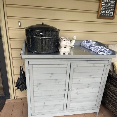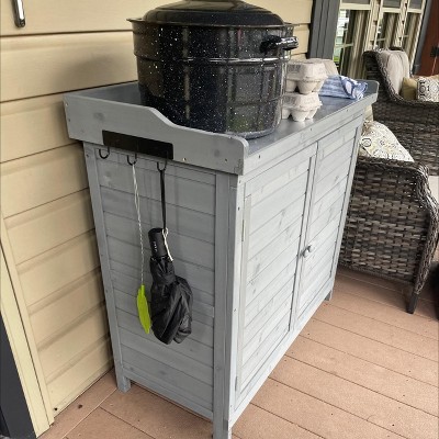This potting table is really cute and great storage . We have it on our covered porch so my husband can keep his work shoes inside . The only thing it has a strong ordor not bad but strong hopefully it will get better as it sits outside . The hooks on the side are great to hang our umbrellas .