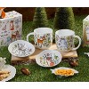 A boxed set of two mugs and two small bowls is decorated with hand-painted friendly forest friends, ready to play. Can you find all 13 forest friends on the back of the gift box? Two assorted mugs (one of each design) and two assorted dishes (one of each design) in a gift box.
