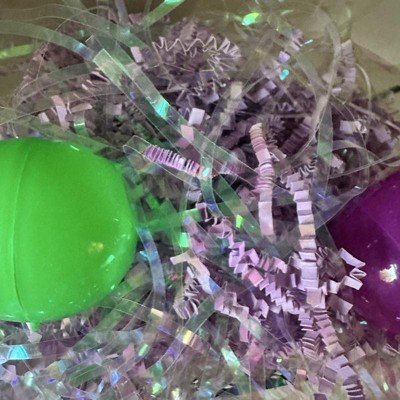 [This review was collected as part of a promotion.] I got the iridescent purple Easter grass by Sprtiz. They make a lot of different colors, but this is the only one I saw that has the iridescent pieces. The pictures I took looks exactly like it does in person. The clear pieces have a neat shimmery rainbow effect, and it even looks like that in low lit areas. 3 oz was exactly the right amount. I could still afford to take some out of the basket if I needed to make room for more eggs! I received an incentive to write this review.