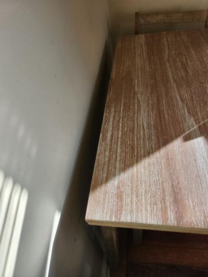 [This review was collected as part of a promotion.] This is a sturdy and heavy table. It has a worn look, which fits in perfectly with my other worn furniture. It looks like it has dings and scratches, but it is part on the charm, although you can feel the grooves, so it may be harder to keep clean. I worry about spraying it with a cleaner, so I will only use a cleaner wipe. It was very easy to put together, although I put on all 4 legs of the table before realizing I had to get the top on first. But it was easy to take apart for that. I put this together by myself and di not really have any issues. Make sure you keep the box in tact so you can rest the table on it while putting on the legs. It has some storage underneath. Right now I have it tucked away and am using it as a computer table. I will easily be able to pull it out if needed for guests. It does not sit flush to the wall with the top folded because the legs stick out a couple of inches. It comes with 2 chairs, which is great when it is folded, but more chairs will be required if you want to fold it out. The 2 chairs do not fit underneath side by side, so only 1 chair per side. Unfolding it is easy enough. All in all, I really like this table. 2 thumbs up