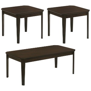 Casual style and simple lines enhance this three-piece occasional table set. Complete with a coffee table and two end tables, each furniture piece offers a rich, dark brown finish that lends a traditional flair. A smooth tabletop also features notched corners that soften the edges. Slim and straight legs extend to the floor and offer a subtle tapered foot. Place this coffee table and two end tables in a compact living room space for a touch of warmth and class.