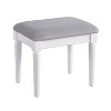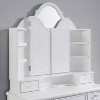 You'll love getting ready in the morning with this old Hollywood-inspired solid wood vanity set. Complete with a tall, tri-fold mirror, this inspired vanity set boasts a gleaming white finish punctuated with glittering, crystal-look knobs on multiple drawers. An included light gray upholstered stool adds a plush, comfortable spot to settle as you choose jewelry, apply makeup or put the finishing touches on your hairstyle.