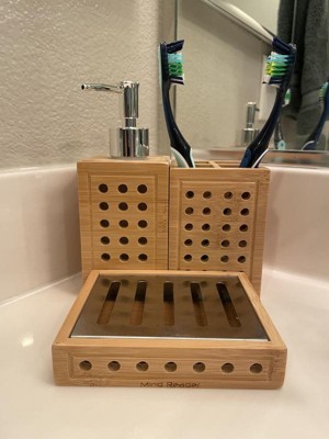 [This review was collected as part of a promotion.] I really like the bamboo look for the bathroom accessories. I wish the soap dish covered my bat soap though. I don’t like the look of seeing used bar soap out but it has worked well with the bar soap I use because it’s nearly double the size as normal bar soaps. The metal part is removable on the soap holder so you can get creative if you want to use it for something else. The soap/lotion dispenser works well I use it for lotion and have had problems with it clogging or anything like that.