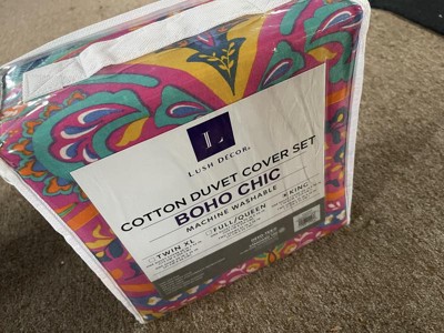 Make a fun statement with your bedroom decor by adding the Lush Decor Boho Chic Reversible Cotton Duvet Cover Set. The vibrant jewel tones and intricate medallion and paisley patterns are perfect for boho or maximalist decor styles. Explore your creative side with this bright colorful duvet with a reversible design, giving you 2 looks in 1! Simply flip the duvet cover over to reveal a paisley pattern to easily switch up your bed decor. The alluring artistry of this reversible cotton duvet cover will become the center focus of your boho hideaway. Take advantage of the jewel tone colors to inspire the rest of your maximalist bedroom design. This duvet cover set is crafted from 100% cotton, offering softness and breathability. Add your ideal insert weight for year-round comfort and easily secure it with button closures and corner ties. STANDARD 100 by OEKO-TEX® certified, all components have been tested and certified free from harmful substances. Caring for this king duvet bedding set is easy, simply machine wash cold on gentle cycle and tumble dry on low. Use an iron on low heat to release wrinkles, if needed.