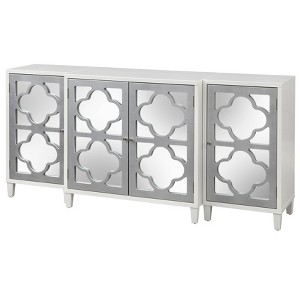 Complete your living space with the 3 Piece Broadway Cabinet Set by Lifestorey. Luxe style offers storage and organization with a double door and two side door cabinets. Each are constructed with a durable pine wood frame, accented with mirrored doors with a unique quatrefoil framework overlay. Finished in two-tone white, and silver. Place all three pieces together or separate as single units for versatility throughout your home.