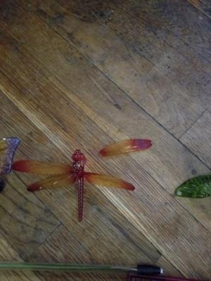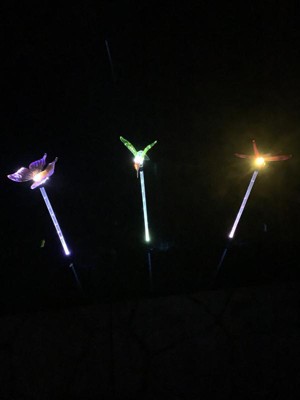[This review was collected as part of a promotion.] These solar fiber optic garden stakes look beautiful in the daylight and in the nighttime they light up in beautiful colors. There is a green hummingbird, a purple butterfly and an amber dragonfly. Unfortunately one wing broke off the dragonfly in shipment. An easy fix with hot glue. The pole lights up as well as the tops. They are beautiful and add such a lovely cheerful touch to my garden.