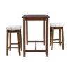 Complementing the table are two sturdy counter stools crafted from acacia wood, upholstered in a chic grey linen blend with eye-catching stripes. These stools not only enhance the set's bohemian aesthetic but also offer durability and comfort. The brushed silver nail head trim adds a touch of refined elegance, making each seat a stylish statement piece in your home. With its robust construction and thoughtful details, the Claridge Bar Set is not just furniture—it's an invitation to elevate your dining experience and create lasting memories with friends and family. Linon Home Décor is dedicated to offering high-quality, stylish furniture that enhances the beauty and functionality of your home, making it a place of comfort and elegance.