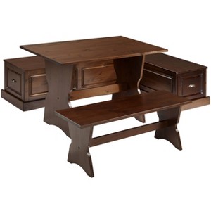 Crafted from durable pine, the Colby Backless Nook ensures long-lasting use while providing a cozy yet practical seating arrangement. The set includes a corner unit, a sturdy bench, and a matching table, all designed with precision and attention to detail. The compact dimensions of the corner bench (63" x 45.5" x 16.8"), bench (40.1" x 13" x 16.6"), and table (42.4" x 26.6" x 29.1") make this piece a perfect fit for smaller spaces, while the drawer offers convenient extra storage (19.56" x 12" x 7.88"). Ideal for anyone seeking a traditional look with modern functionality, this nook enhances both the style and efficiency of your kitchen. Linon Home Décor is dedicated to offering high-quality, stylish furniture that enhances the beauty and functionality of your home, making it a place of comfort and elegance.