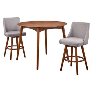 Highlight your homes interior with the Mid-Century inspired 3Pc Derby Counter Height Dining Set by Lifestorey. Ideal for contemporary interiors, featuring a round 36-inch-high table and two stools that swivel 360-degrees. The 46-inch diameter tabletop provides roomy meal space, with counter height stools, making the set perfect for breakfast nooks, smaller dining spaces and casual eating areas. Fully upholstered stools feature cushioned seats in a neutral gray linen-like fabric with sloped arms, curved backs, angled legs, and a footrest for added comfort. Table and chair legs are constructed with solid rubberwood and the tabletop with durable MDF in a rich walnut finish. Stool dimensions: