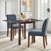 The Estelle 3 Pc Drop Leaf Dining Set from Buylateral is ideal for small space living. The table easily extends to 47.5 inches with both leaves open to provide additional space when needed. Constructed of MDF with solid rubberwood legs in an espresso finish, this table offers versatility allowing you to open one or both leaves. Paired with a parson style dining chair for a contemporary look that is fashionable and comfortable; upholstered in a slate blue linen-like fabric with padded seats and backs with light walnut finished legs.