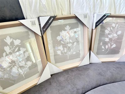 Add a warm and casual accent to your home with the Madison Park Fair Florets 3-piece Framed Glass Wall Art Set. Each framed piece showcases a soft white flower printed on a neutral hued ground, placed under glass for an elevated gallery look, and finished with a natural wood tone sloped frame for a unique and charming update.