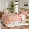 Refresh your sleeping nook with a touch of modern flair with this 3-Piece Block Pattern Comforter Set from Hearth & Hand™ with Magnolia. This multi-piece bedding set is made from a midweight fabric blend of lyocell, cotton and linen with lyocell-cotton blend backing for comfortable use. It includes a comforter and two standard pillow shams adorned with a seamless block pattern for a charming look. The comforter's soft filling helps keep you cozy, and a convenient 6-inch envelope closure on the shams allows for easy pillow insertion and removal.