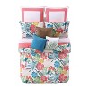 Bright palm prints dominated by a coral color with printed parrots hidden in the main face fabric of the comforter and shams. This pattern is printed on a 100% cotton fabric and is fully accessorized. The casual feel take you back to the beach place with those lazy days and warm nights. Face cloth is 200 thread count cotton fabric with a 180 thread count cotton reverse cloth. This item is machine washable; however, please take care to use the appropriate size machinery. This item is made in China. Set includes: one duvet cover 92x96 inches and 2 standard shams 20x26 inches with fold enclosure. Duvet insert not included and should be pruchased separately.