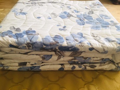Spruce up your bedroom with the Kasumi collection from Cannon. This bedding set features a watercolor floral print on a white background with a solid white reverse. The blue flowers are enhanced with brush stroke detailing that continues throughout the bed up to the shams. The microfiber fabric allows for a soft and supple feel that will be comfortable all year round. Quilt face is a printed 85 GSM microfiber polyester fabric that reverses to a 85 GSM solid microfiber with multi needle quilting. The quilt is filled with 200GSM filling made of 51% cotton and 49% polyester. This item is machine washable; however, please make sure equipment is large enough to allow the item to move freely in wash. This item is imported from China. Set includes: one quilt 90 long by 90 inches wide and two standard shams 20 inches tall and 26 inches wide.