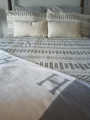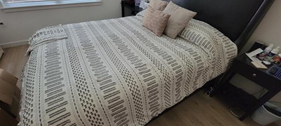 [This review was collected as part of a promotion.] This little outfit is very lovely. With charcoal stitching, it is available in ivory. And I adore that the hue is neutral. Although the design is not overt, it nonetheless jumps out. Additionally, I appreciate the cotton's softness on my skin. The blanket is not particularly thick. but rather a heavier quilt. And because I have a mattress that is 18 inches thick on top of a platform frame, I did choose a Queen size.