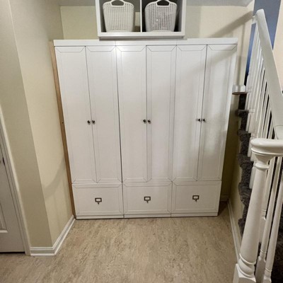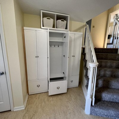 With all the storage of classic built-in cabinetry, the Harper 3pc Entryway Set is the versatile home organization set you need. Featuring three pantry closets side by side, this modular set can adapt to the ever-changing needs of a bustling household. Each unit has three adjustable and removable shelves inside the cabinet. By removing the shelves within the cabinets, you can install the hooks for hanging storage in an entryway or mudroom. The finishing touches are three full-extension storage drawers with label holder hardware that can be customized with personal labels. The Harper 3pc Entryway Set is modular in design and can pair with other items within the collection. OVERALL PRODUCT DIMENSIONS: 66”W X 12.5”D X 74”H