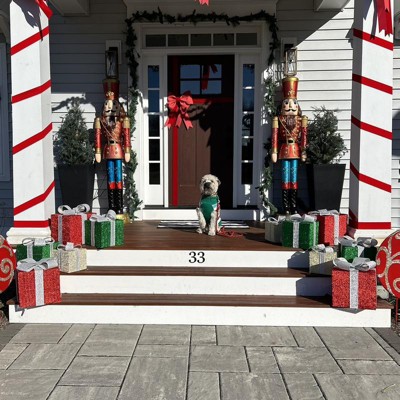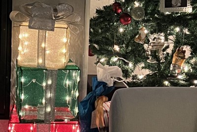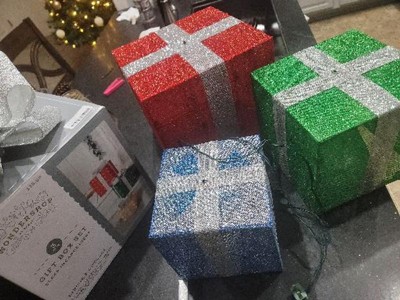 A: The set includes three tinsel gift boxes, instructions, and ground stakes for secure placement.