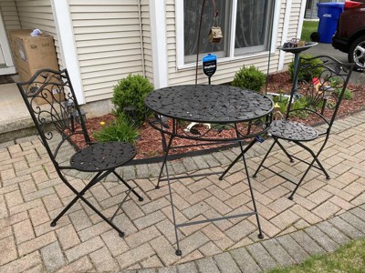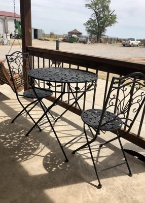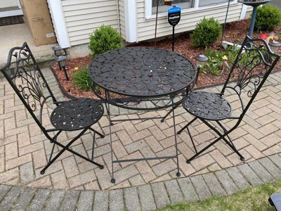 [This review was collected as part of a promotion.] One of the best parts of this bistro set to me, is the easy assembly. No tools needed. You pull it out the box, unfold and its ready to use. I like that because it will be easy to fold up and put away at the end of the season, or to move around to multiple parts of the deck or yard to move around. The leaf design is a great pattern, and I like the way it looks at fits with my other outdoor décor. It is comfortable to sit on, and we enjoy sitting outside using at the bistro table with our morning cup of coffee. The Table and chairs seem sturdy and hold up to our weight. Day or night this is a great set to sit outside and enjoy the nice weather.