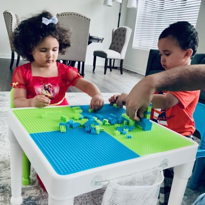 [This review was collected as part of a promotion.] This table is really really cute. My three year old plays with it, and he loves building on it. Ive noticed that the brand name building pieces are not compatible with this table- only the blocks that the table comes with is compatible. I was disappointed to see that some of the building blocks came cracked- imagine if i did not go through them and my son had cut his hand on it. Furthermore, it is really really light....to the point where my one year old sits on the chair and kicks the table, and it will fall over. I do like the aesthetics of the table and that it turns into a regular table or a play table, however, I do wish that it was more stable, and safe.