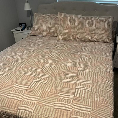 Very unique print...like many comforters, if you have thick mattress, it is a bit short on my king bed. Found a very reasonable elastic bedskirit in taupe and it is perfect with it. I washed it before using, and it came out perfectly-did not dry it completely, but hung over railing for a few hours.