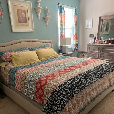 Transform your bedroom into a boho retreat with the Lush Decor Bohemian Stripe Cotton Quilt Set. Indulge in the enchanting allure of this boho bedding set, featuring a symphony of artistic patterns and a kaleidoscope of exquisite hues. This striped quilt unveils a myriad of colors and decorative prints. With its classic medallion motifs, gentle botanical prints and mesmerizing geometric patterns, the printed patchwork front is a tapestry of stories waiting to be told. This reversible cotton quilt gives you 2 looks in 1 set. Flip it over to reveal a geometric print, adding versatility to your boho bedroom decor. Ideal for lovers of bohemian style, this boho quilt also looks great in maximalist decor styles. This 3 piece king bedding set includes one quilt and two pillow shams. Crafted from 100% cotton fabric, this king quilt set offers softness and breathability. The lighweight cotton blend filling is perfect for any season. This king size quilt set is STANDARD 100 by OEKO-TEX® certified, all components have been tested and certified free from harmful substances. Caring for this king quilt set is easy to maintain. Simply machine wash cold on the gentle cycle and tumble dry low for a quick refresh. If needed, use non-chlorine bleach for cleaning or an iron on low heat to release wrinkles.