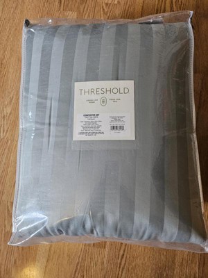 Add stylish texture and dimension to the top of your bed with this 3-Piece Luxe Striped Damask Comforter and Sham Set from Threshold™. This luxe striped bedding set includes a comforter and pillow shams for a complete look. The soft-filled comforter wraps you in cozy comfort, while a five-inch inner envelope keeps the pillow insert tucked in with a neat finish. The comforter bedding set is made from 100% cotton shell (polyester fill) for soft, cozy comfort, and its machine-washable design makes for easy care.